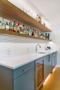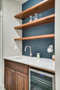 What do you plan to use the bar for? Whether you’re a host at heart or you enjoy storing some of your favorite bottled finds, it’s crucial to plan for how your home bar will function. Think about if you’ll need an ice maker, a sink, a mini fridge, how many storage shelves you’ll need, or if you’ll need a space for an espresso machine. Every detail matters!