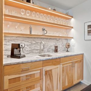 Speaking of storage shelves, even if you’re not looking to display bottles, these and any form of organization are important to keeping a small space neat. Consider making space for glassware, bar tools, mixers, and garnishes through custom cabinetry and unique shelving.